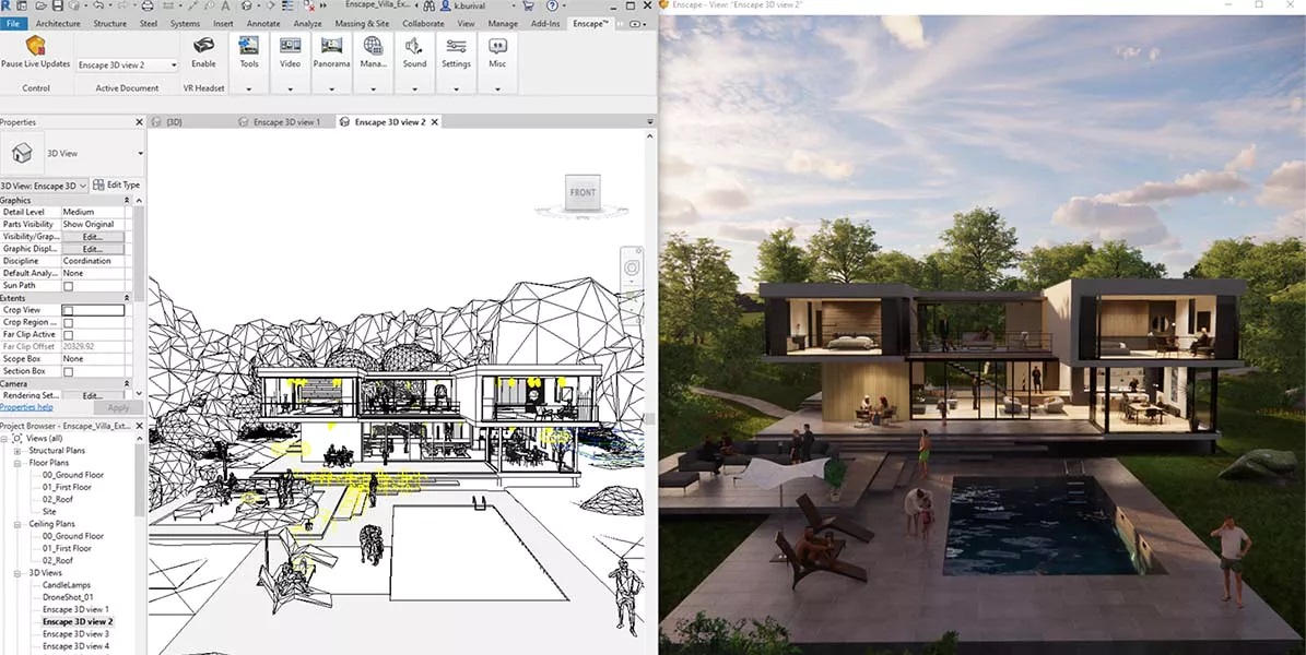 Enscape, developed by Chaos Group (formerly Enscape GmbH), is a real-time rendering and VR plugin integrated directly into popular modeling tools like Revit, SketchUp, Rhino, and ArchiCAD. It’s known for its smooth workflow and direct integration, allowing architects to visualize designs instantly without exporting models. Enscape is widely used for client presentations thanks to its interactive walkthroughs and live synchronization features.